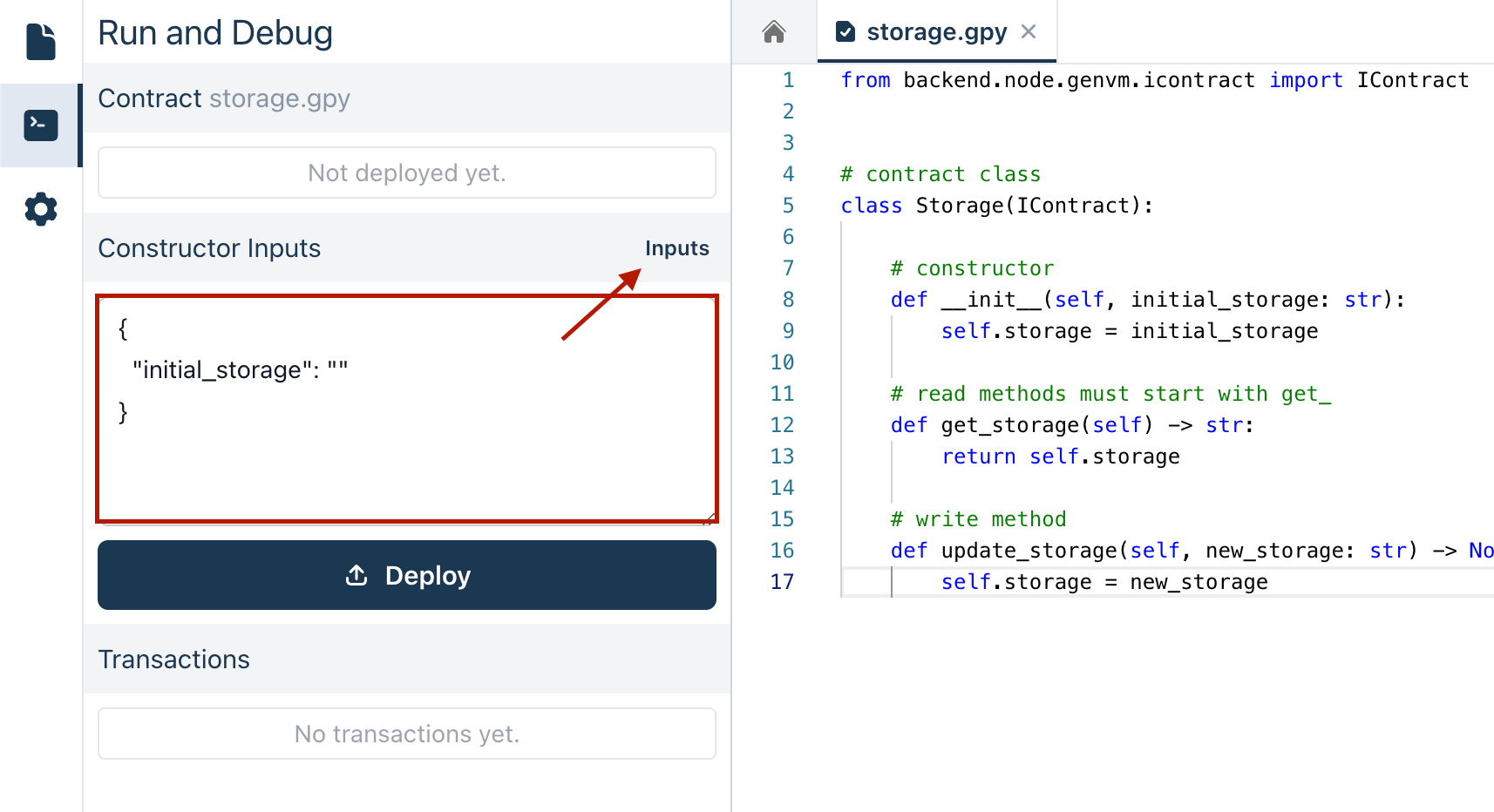 1. After loading your Intelligent Contract, you will see the Constructor Inputs section on the left-hand pane. The constructor parameters are automatically detected from your code if defined properly.