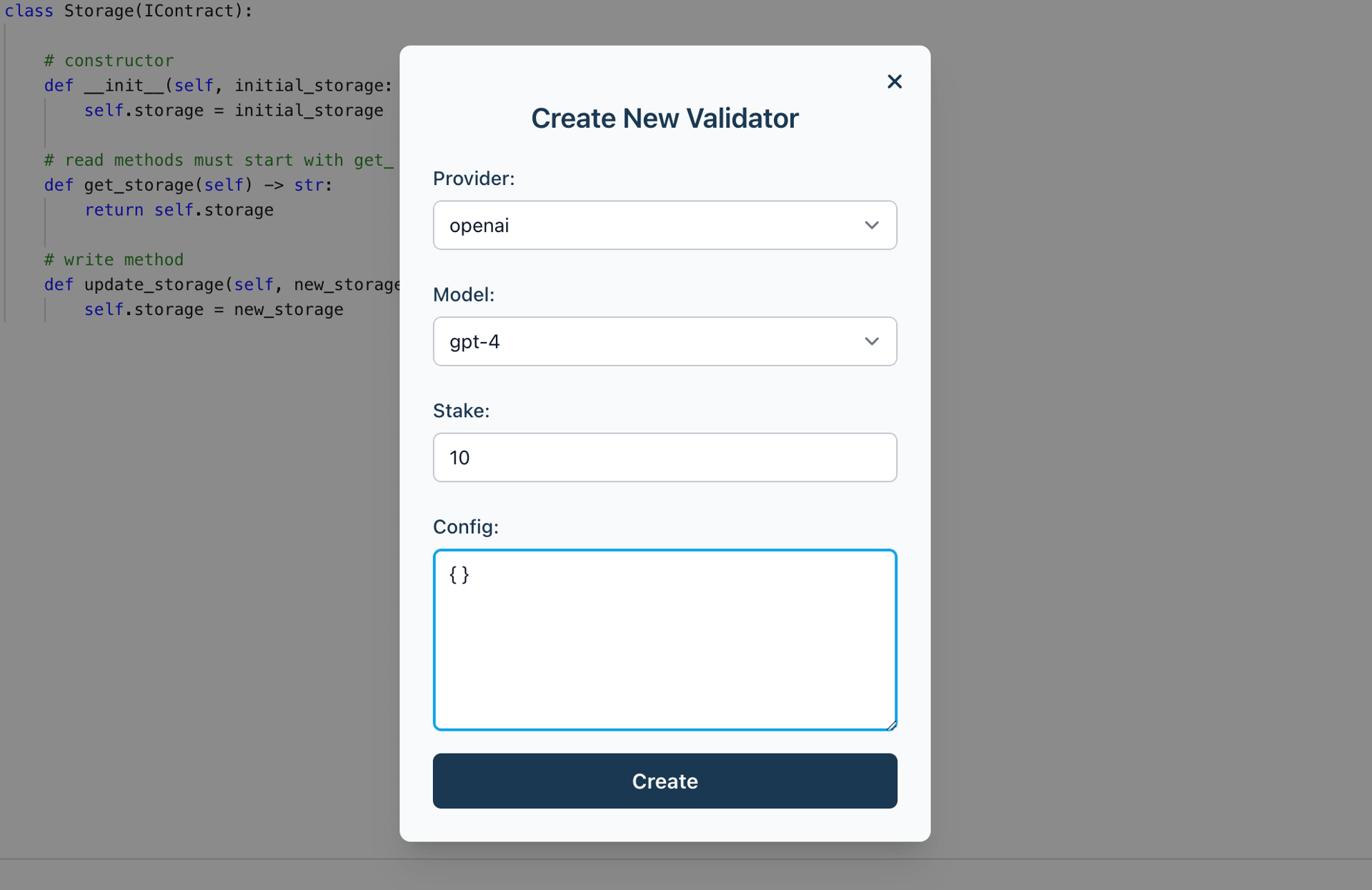 1. Create New Validator: In the validator creation dialog, fill in the required fields: